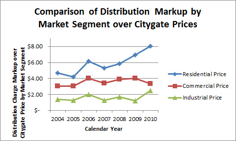 If we subtract the variable cost of the price of natural gas at the citygate, from each of the prices, it is very easy to see residential customers have experienced an increase in their markup for every thousand cu.ft. of natural gas used, while the increases to the commercial and industrial customers have been virtually zero and small, respectively.